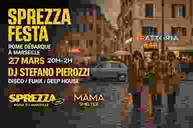 🇮🇹 SPREZZA FESTA — Rome débarque à Marseille Le temps d’une nuit, Marseille parle italien. Sprezza Club transforme Mama Shelter en véritable trattoria disco sous néons romains. Une immersion entre Dolce Vita, groove vintage et énergie club moderne. Aux platines, directement depuis Rome : DJ Stefano Pierozzi Un voyage sonore entre Disco, Funk & Deep House, entre Rome 70’s et dancefloor contemporain. Amoureux de l’Italie: On commence à l’aperitivo. On finit sur le dancefloor. Places limitées