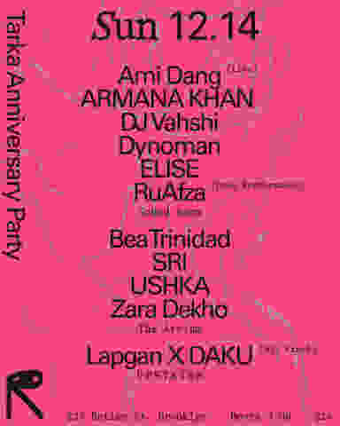 To celebrate an unforgettable 2 years of Tarka, we are taking over all of Public Records for an all-day celebration of music across the diaspora. This star-studded lineup of DJs, live performers, and drag artists is bound to keep you energized and mesmerized, so lock in and don’t miss out. In the Sound Room, we have the spell-binding Ami Dang performing a live set, ARMANA KHAN serving the signature ARMANA KHAN experience, RuAfza’s spectacular drag performance, and unforgettable sets by co-founder Dynoman, ELISE, and DJ Vahshi. UPSTAIRS, Chicago’s Lapgan & Daku bring their all-vinyl set to the celebration. In The Atrium, we have the body-grooving beats of USHKA, SRI, Bea Trinidad, and co-founder Zara Dekho. Tarka turns two. Come and join the celebration. - Public Records aims to provide a safer space. We reject all forms of discrimination, including racism, misogyny, transphobia, homophobia, sexism, and other aggressive behavior. Consent is paramount. Please exist with respect for yourself and those around you. Anyone found in violation of our rules or safer space policy will be removed from the venue. To share feedback about an incident, please email hello@publicrecords.nyc or alert a member of our team. Tickets may be available at the door based on capacity. A ticket does not guarantee entry; admission into the venue, including UPSTAIRS, is subject to the discretion of our staff. All large bags + coats must be checked.