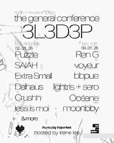 3L3D3P invites shareholders to the general conference: an alt-rave in a warehouse gallery with 7 musical acts and curated art installations. Live sets by 3L3D3P, voyeur, bbpue, lightris + sero. DJ sets by Ren G, Océane, and moonbby. A VIP ticket gets you: - Pre-doors access - Guaranteed custom merch - Your name on a an exhibited artwork’s plaque (if purchased before March 4th) - A shout-out in an IG post a @3rd.space.nyc show